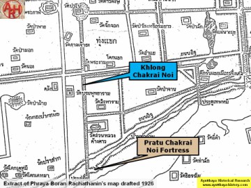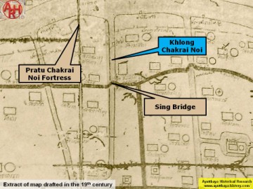 Khlong Chakrai Noi is situated on Ayutthaya's city island outside the Historical Park in Pratu Chai sub-district. Only some small stretches of the former canal remain on the premises of the Rajaphat Institute, South of Rojana Rd. The premises of the Sam Chao Phraya Museum show also a stretch of water, but here the old canal has been probably altered. Khlong Chakrai Noi had its exit in the loop of the old Lopburi River around the city, a river which became in the 19th century the Chao Phraya River due to northern deviation works in the 19th century (See the essay: Ayutthaya's Everchanging Waterways). At the mouth of the canal was one of the eleven water gates of the city; a water gate called Pratu Chakrai Noi. This water gate was very close to a famous land gate called Pratu Chai or the "Gate of Victory"; a gate where the most important guests were received with ceremony. The largest sub-district of Ayutthaya at present still bears the name Pratu Chai. On the eastern bank of the canal stood once a fortress called Pom Pratu Chakrai Noi, which foundations were still visible in Phraya Boran Rachathanin's time. On the opposite site of the "Mae Nam" was the mouth of Khlong Khu Cham, an important canal south of Ayutthaya. Temples along the west bank of Khlong Chakrai Noi were Wat Borom Phuttharam and Wat San Jao Thong. Wat Pa Nai stood at its northern extremity in a marshy area at the confluence with another canal leading to Khlong Pratu Thep Mi and further up to Khlong Pratu Jin. Phraya Boran Rachathanin's map shows three canal connections with Khlong Pratu Thep Mi; one near Wat Pa Nai, one south of Wat Phra Ngam and one between Wat Singharam and Wat Suan Luang Khangkhaw. A mid-19th century map shows only a single connection with Khlong Pratu Thep Mi north of Wat Pa Nai. The canal was crossed by a road on at least one place in the vicinity of Wat Borom Phuttharam. On this crossing stood the Sing Bridge. The meaning of the word "chakrai" (ฉะไกร) is unknown to the author. It could be a corruption of the word "ฉัตร", a many tiered (royal) umbrella and the word "ไกร" meaning powerful or mighty. The canal could as thus have received the name "Little Canal of the Mighty Royal Umbrella". The latter remains of course a pure guess. |