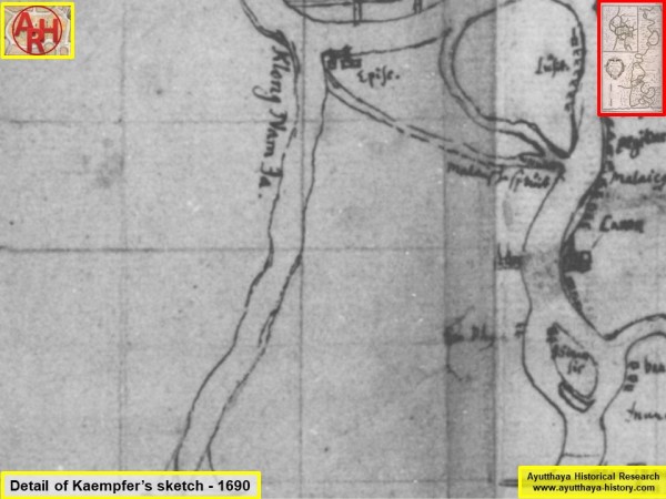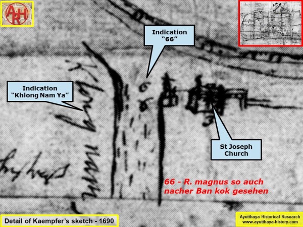 | Engelbert Kaempfer (1651-1716), who resided in Ayutthaya in 1690 on his way to Japan, depicts Khlong Nam Ya on his initial sketch as a quite wide canal, in which a smaller waterway, Khlong Takhian, splits off. The mentioning "66" on Kaempfer's sketch and its explanation - R. magnus so auch nacher Ban kok gesehen (2) - indicates clearly that it was possible to travel south to Bangkok via Khlong Nam Ya. The latter joined the Chao Phraya River at Ban Pak Nam of Ban Khlueng Sub-district in Bang Sai, near the present Wat Pak Nam. Because the Chao Phraya River was deviated from Ban Kum to Ban Mai and continued to Hua Leam at Ayutthaya in the mid-19th century, her old river bed became part of the Noi River. [1] |