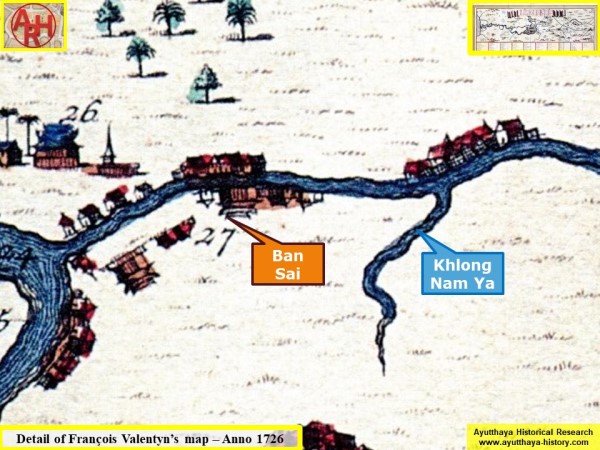 | François Valentyn (1666-1727) in his work "Oud en Nieuw Oost-Indiën" mentions Khlong Nam Ya, stating that the tributary was situated 2 or 3 Dutch miles north of Ban Sai (3): "One encounters on the left-hand side two, and on the right-hand side one village, named Ban Thraay, where nearby lies a very beautiful building of the King. Two or three miles higher up North one has on the right-hand side a branch, which debauches into the Me-nam, and on the left-hand side again a village; […]" (4) [2] Valentyn, who never traveled to Ayutthaya, had no clue in which direction the canal was going and drew the waterway short. Interesting in this detail of the map is the village opposite the mouth of the canal, which is today Ban Khae Tok. |
