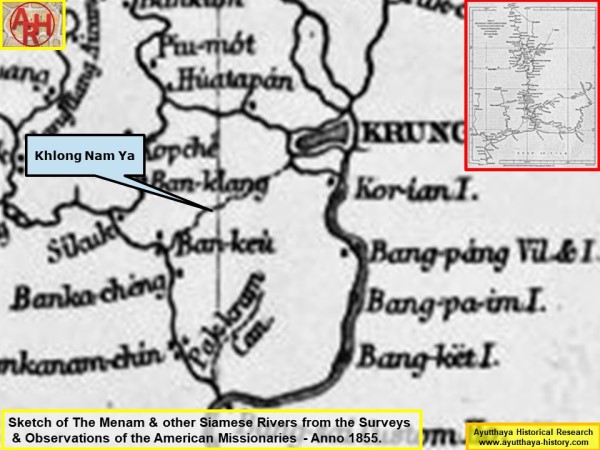 | Khlong Nam Ya can clearly be seen on a map named "Sketch of The Menam & other Siamese Rivers from the Surveys & Observations of the American Missionaries, Communicated by Mr. Consul Parkes 1855", published for the Journal of the Royal Geographical Society by J. Murray. Albemarle Str. London 1856. The canal split off from the Takhian Canal identical as shown by Kaempfer. Notice that on this map the Chao Phraya River was not yet deviated towards the northwestern point (Hua Laem) of Ayutthaya's city island, but it was Khlong Maha Phram aka Khlong Hua Taphan which connected the Chao Phraya River with the Lopburi River on the western side of Ayutthaya. On this map, we see that the canal has its mouth at “Ban Keù”, which is probably the indication for “Ban Khae”, spread over “Ban Khae Ok” on the left bank and “Ban Khae Tok” on the right bank of the old Chao Phraya River. |