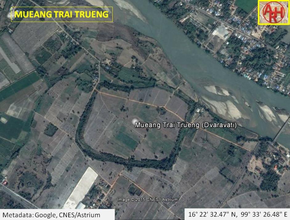| Mueang Trai Trueng is located 16 Km south of old Kamphaeng Phet along the route Khamphaeng Phet - Khlong Lan in Trai Trueng Sub-district of Kamphaeng Phet. The ancient town situated on the west bank of the Ping River, dates from the Dvaravati period (6-11th century A.D.). A large number of Dvaravati objects such as glass beads, fragments of earthenware lamps and unglazed pottery were found. Especially the fragments of the lamps, being the same type as those mostly found in the Chao Phraya Basin suggest the prehistoric settlements of Kamphaeng Phet were located on an ancient route between the central plains and areas of land in Hariphunchai (Lamphun). [1] |