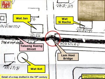Saphan Lam Hoei (Lit: the Bridge of the Wry Waterway) is located on the city island in Pratu Chai Sub-district. The structure can be found at the crossing of the present Pa Thon Road with Khlong Tho Road. The remains of the old bridge are situated under the present wooden bridge. The brick bridge was built over Khlong Tho - Khlong Chakrai Yai, a canal which was a shortcut in the loop of the old Lopburi River. Today the canal starts in Khlong Mueang or City Canal in the north (adjacent the ancient Grand Palace) and has its mouth at Pratu Chakrai Yai in the Chao Phraya River in the south. The bridge stood north-northeast of the today defunct Wat Khok Khamin. The remains of the foundations of this bridge became visible in 2017, when the Fine Arts Department made archaeological excavations along Khlong Tho - Chakrai Yai and encountered some brickwork. The bridge connected the road coming from Ayutthaya's ancient ring road behind the Rear Palace in the west - called Thanon Law or "Lao Street" - with Thanon Talaeng Kaeng or the "Street of the Gallows", connecting further east with Thanon Pa Thon. There was a fresh market called Lam Hoei Market to the east of the bridge in the Ayutthaya period. [1] The Lam Hoei Bridge is visible on Kaempfer's map published in his book The History of Japan (1727). [2] References: [1] Phanna phumisathan Phra Nakhon Sri Ayutthaya: Ekasan jak Ho Luang - Geographical description of Ayutthaya: Documents from the palace - Dr. Vinai Pongsripian - Bangkok, Usakane, n. d. (2007). [2] Kaempfer, Engelbert (1727) - The History of Japan (Together with a Description of the Kingdom of Siam) - London, John Gaspar Scheuchzer. Consulted works: [1] Athibai phaenthi Phra Nakon Sri Ayuthaya - Phraya Boran Rachathanin (1908). [2] Phaenthi Krung Sri Ayutthaya - Phraya Boran Rachathanin (1926). [3] Discovering Ayutthaya - Charnvit Kasetsiri & Michael Wright (2007) - Toyota Thailand Foundation. |