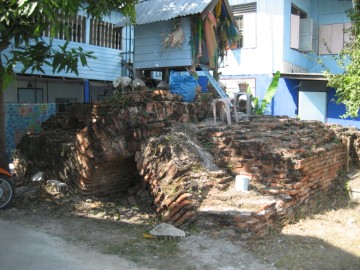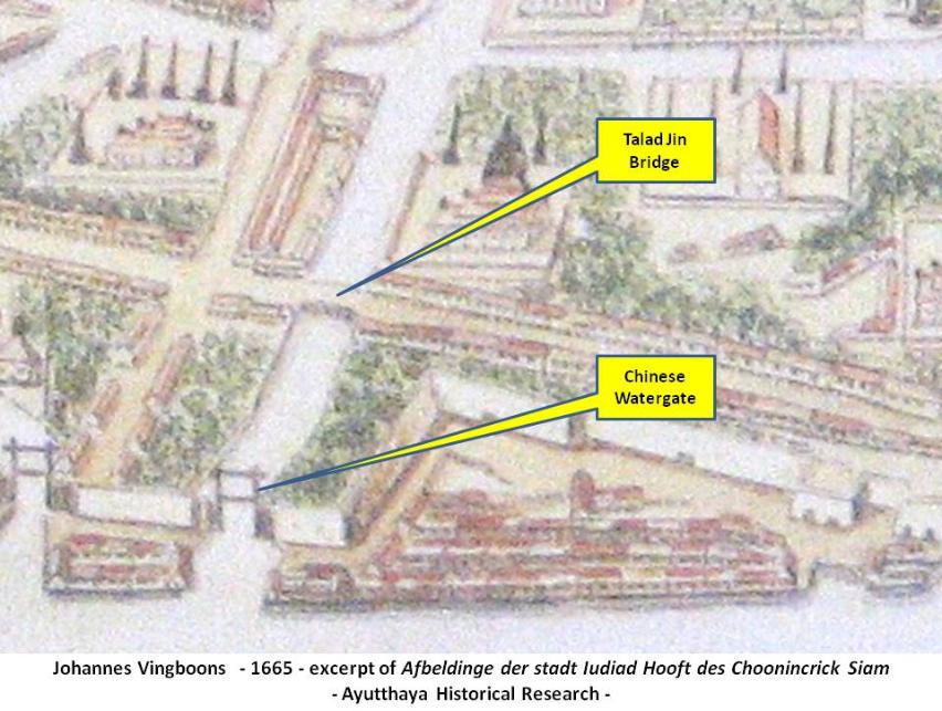 Saphan Talat Jin or the Bridge of the Chinese Market is located on the city island in Pratu Chai.Sub-district. The brick bridge was built over Khlong Pratu Jin (also called Khlong Pratu Khao Pluak in the northern stretch) which connected the old Lopburi River (later Khlong Mueang or City Canal) in the north (near Wat Tha Sai) with the Chao Phraya River in the south at Pratu Chin. This canal was filled in last century and as thus at present inexistent, with the exception of a small stretch of water between Wat Tha Sai and Wat Racha Praditsathan, close to its former mouth, called Pratu Khao Pluak. Only some brick work of the former bridges remain as a last witness of the past. The bridge linked the Moorish quarter with the Chinese quarter on the island. Major Chinese communities were located in the east of Ayutthaya and lived on both banks of the Pa Sak River. Close in its vicinity towards Pratu Jin was a Chinese market selling enameled brass [1]. Brick work of the arched bridge still can be seen in situ. The site is located south of the brick work of the Chikun Bridge, an easy to find location near the round point in central Ayutthaya. Johannes Vingboons (c.1616 - 1670), a Dutch cartographer, created a painting named "Afbeldinge der stadt Iudiad Hooft des Choonincrick Siam" published in Vingboons Atlas around 1665. Although the city’s shape is distorted in this painting, the "Bridge of the Chinese Market" can clearly be seen. References: [1] Discovering Ayutthaya - Charnvit Kasetsiri & Michael Wright (2007) - page 149. |