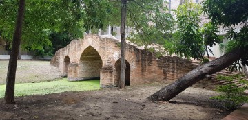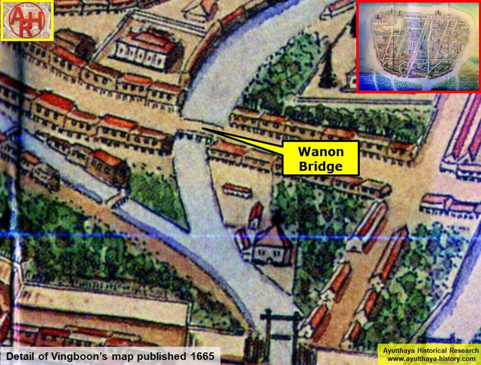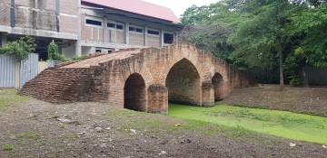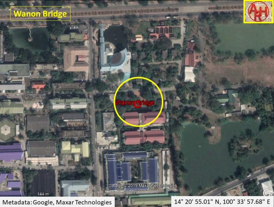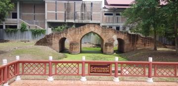 | Saphan Wanon or the Monkey Bridge and sometimes called Thep Mi Bridge is an old bridge located on the city island in the southern part of Ayutthaya in Pratu Chai Sub- district. The bridge is situated behind the Ayutthaya Historical Study Center. Wat Am Mae (vanished) stood before in its vicinity (south). The brick bridge was built over Khlong Pratu Thep Mi, which connected the old Lopburi River (later Khlong Mueang or City Canal) in the north with the Chao Phraya River in the south at Pratu Thep Mi. The northern part of the canal was called by the locals Lam Khu Pak Sra and cut through the Bueng Phra Ram area. Khlong Pratu Thep Mi was partly filled in after the fall of Ayutthaya in 1767 and is as thus at present inexistent. The foundations of the Wanon Bridge are still visible. The brick bridge in European style was probably identical to Saphan Pa Than. It was an arched construction with three sharply curved bows, the middle one higher and wider than the two others, making it possible for boats to pass underneath. The Wanon Bridge is mentioned in the old texts of the Kamhaikhan Khun Luang Ha Wat, the Kamhaikhan Khun Luang Wat Pradu Songtham and the Athibai phaen thi phra nakhon si ayutthaya from Phraya Boran Rachathanin wherein is written that there was "a brick bridge called Monkey Bridge, from Great Khaek Village Road to Net Village Road across the Thetsami Gate Canal …" [1][2] The Wanon Bridge connected west towards the White Clay Bridge (also called Sing Bridge) over Khlong Chakrai Noi and east towards the Talat Jin Bridge over Khlong Pratu Jin. Some remnants of the Wanon Bridge were still visible until the Year of the Great Flood (2011). In the years after, there was a large overhaul of all the monastic ruins in and around the City of Ayutthaya. The old structure was unfortunately not preserved and a completely new bridge was constructed in situ. The bridge is situated in geographical coordinates: 14° 20' 55.01" N, 100° 33' 57.68" E. References: [1] Phanna phumisathan phranakhon si ayutthaya: ekkasan jak ho luang [Geographical description of Ayutthaya: Documents from the palace]. Edited by Winai Pongsripian. Bangkok: Usakane, n. d. [2007]. [2] Athibai phaen thi phra nakhon si ayutthaya - Explanation of the map of the Capital of Ayutthaya with a ruling of Phraya Boran Rachathanin - Revised 2nd edition and Geography of the Ayutthaya Kingdom - Ton Chabab print office - Nonthaburi (2007). |