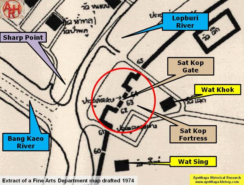 Pom Sat Kop or the Fortress of the Frog was one of the sixteen fortresses (1) along the city walls of Ayutthaya. Sat Kop fortress guarded the north-western part of the city. The fortress was situated at the present military barracks and stood opposite Hua Laem (spear head, sharp point), a cape formed at the confluence of the Chao Phraya River (before the Bang Kaeo River) and Khlong Mueang (before the Lopburi River). Prince Damrong situates the construction of Sat Kop and Pom Phet (a fortress in the south-east of the city, just opposite Bang Kaja) during the reign of King Maha Chakkraphat (r. 1548-1569), shortly after the first attack of Ayutthaya by the Burmese in 1549 [1]. King Chakkraphat realized that Ayutthaya had entered the age of the gunpowder and large guns came to dominate the war theater and thus strengthened the defenses of the city by a series of construction works: city walls were reinforced and redone in brick (brick does not shatter on impact from a cannon ball as stone does); a new northern moat was dug to protect the northern part of the city - the Maha Nak Canal; and walled fortresses were built along the city wall, mostly at waterway intersections. [2] Sat Kop is named in the Royal Chronicles of Ayutthaya as the "Fort behind the Frogs". The Burmese occupied in 1766 positions at Ban Pom and Wat Ka Rong and started to establish a stockade at Wat Phukhao Thong. Phraya Sri Suriyaphat who commanded the Sat Kop Fortress, had a large gun called the Grand Black King of Death, prepared to shoot at the new Burmese position. The King of Death was loaded with a double charge of gunpowder and two canon balls. Only one round was fired and the large gun was temporary disabled. Afterwards the Siamese managed to use the gun again and succeeded in sinking two Burmese fighting boats. [3] The fortress consisted of two bastions connected by a curtain with battlements. The Sat Kop Gate was situated in between the two bastions. On the road in front of the Sat Kop Gate there was a fresh market. [4] At the south side of the fort was the mouth of Khlong Fang which ran into the main Khlong Tho. Wat Khok was located behind the fortification. Most parts of the wall and the fortresses were dismantled in the reign of King Rama I, who had the bricks taken to be used in the construction of the new capital in Bangkok. [5] Footnotes: (1) Not taken into account the fortresses surrounding the Grand Palace. References: [1] Our Wars with the Burmese - Prince Damrong Rajanubhab (1917) - Re-edited White Lotus (2001) - page 66. [2] A History of Siam - W.A.R. WOOD (1924) - page 114. [3] The Royal Chronicles of Ayutthaya - Richard D. Cushman (2006) - page 512 / Source: Phan Canthanumat, British Museum, Reverend Phonnarat & Royal Autograph. [4] Markets and Production in the City of Ayutthaya before 1767: Translation and Analysis of Part of the Description of Ayutthaya - Chris Baker - Journal of the Siam Society, Vol. 99, 2011 - page 65. [5] A History of Siam - W.A.R. Wood (1924) - page 273. |