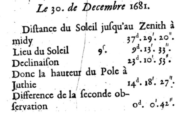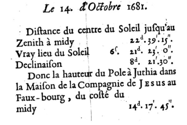 | He determined the latitude of his location on his first observations at 14° 17' 45" N latitude. This is the first scientific astronomical observation that is known to have been made from Siam. Thomas conducted further observations on 30 December 1681 in better weather conditions and found that his position was 14° 18′ 27″ N, a difference of 42' with his first observations. He concluded from these observations that his position was 14° 18' 20" N (which is plotted at present, south of Wat Kai Tia, about 2.5 Km south of the San Paulo Church). |