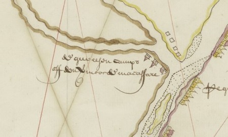 | The Makassar Camp on Leupe 267 (De geweezen Campo off den vermoorde macassare) - Kaart van de Rivier van Siam, van de Zee tot aan de Stad Siam ofte Judea (unknown Dutch map maker) |