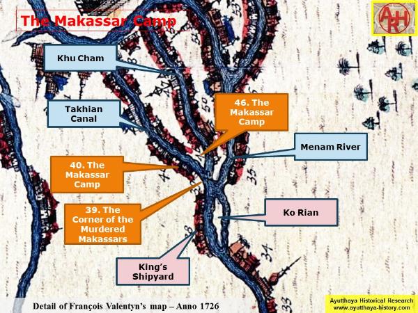 | North of the Makassar Camp and across the Takhian Canal on the east side of the Cham Moat was the Portuguese settlement. The Malay Settlement was situated east of the Portuguese Campon, on the westside of the Cham Moat and north-northwest of the Makassar Camp. Nearly 1 Km south of the Makassar Camp was the King's shipyard, situated opposite Ko Rian in Ban Kai Tia. West of the Makassar Camp there were only fields. The area south of Ayutthaya was especially dedicated to the Makassars, because of the proximity of the Malay and Cham settlements, which had the same Islamic Sunni religion and had already some mosques built. |