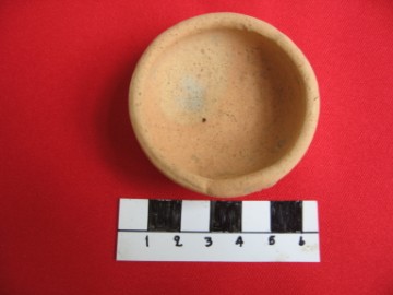 Object data Terracotta incense or oil-burning receptacle in Ayutthaya style. Circular. Used for holding oil in a lantern Size: 5,5 cm diameter Period: 16th century Excavation data Unearthed during excavations at San Petro village Site Number: C12 Stratum: 150-200 cm |