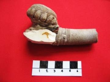 Object data Stoneware tobacco pipe. Ayutthaya style. The bowl of the pipe has a design of lotus petals. Type common in the northern part of Thailand. In poor condition. Broken parts have been mended. Size: 9,5 cm x 5 cm Period: 16th-17th century Excavation data Unearthed during excavations at San Petro village Site Number: C5 Stratum: 352-400 cm |