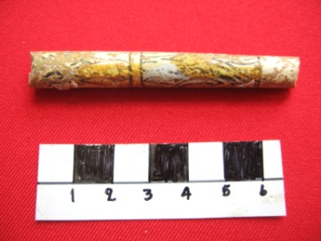 Object data White clay tobacco pipe stem. Dutch style. At some points there is a design round the stem. In poor condition. Size: 9,5 cm long. Period: 16th-17th century Excavation data Unearthed during excavations at San Petro village Site Number: A6 Stratum: 0-100 cm |