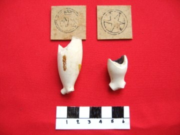Object data White clay tobacco pipe. Dutch style. Decorated with the letters "WS" and a crown. Believed to have belonged to Willem Stevensz de Jonge. In poor condition. Size: 4,5 cm long x 2 cm diameter. Period: 17th-20th century Excavation data Unearthed during excavations at San Petro village Site Number: A7 Stratum: 0-100 cm Object data White clay tobacco pipes. One is engraved with a six-pointed star and manufactured between the years 1670 and 1675/1685. Size: various. Period: 1667-1897 Excavation data Unearthed during excavations at San Petro village. Site Number: B7 Stratum: 0-100 cm |