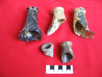 Object data Different types of glass bottle necks. Foreign style. Size: 3 cm diameter Period: 1650-1700 Excavation data Unearthed during excavations at San Petro village Site Number: E4, D11, B9 Stratum: 0-100 cm |