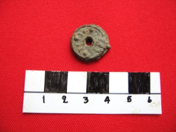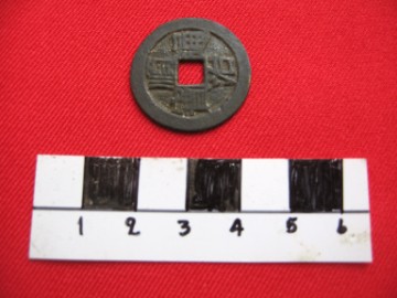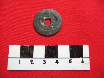 Object data Cupper Chinese coin "I Paeh". Chinese Chíng Dynasty style. On the front face are four Chinese characters which read "Tsun Jeu Thong Pao" made in the year Tsun Jeu. This fell during the first reign of the Ching Dynasty (Tsu Chu). Size: 2,5 cm diameter Period: 1644 Excavation data Unearthed during excavations at San Petro village Site Number: C12 Stratum: 200-250 cm |