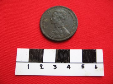 Object data Copper coin of 1 solas. Rattanakosin. Coin from the reign of King Chulalongkorn. On the face is an image of King Chulalongkorn and the words in Thai script "Chulakorn"and "Phra Chulachomklao Chao Krung Siam. The obverse bears a picture of the guardian spirit of Thailand seated on the national emblem, the words in Thai script "Neung Solas" and the figure 115. Size: 3 cm diameter Period: 1898 Excavation data Unearthed during excavations at San Petro village Site Number: C8 Stratum: 0-100 cm |