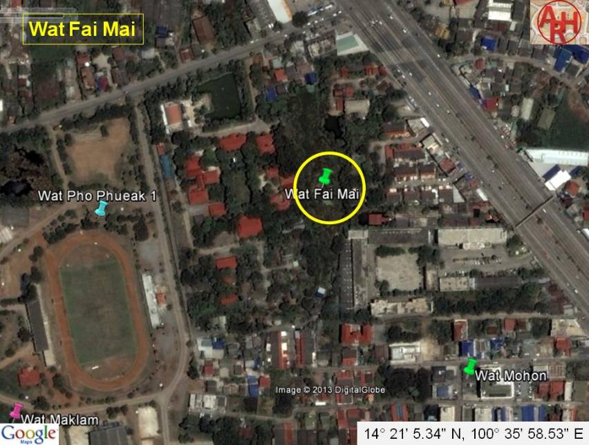 | Wat Fai Mai was once located east of Wat Yai Chai Mongkhon in the eastern sector of Ayutthaya, outside of the city island. Unfortunately, this monastery may have been destroyed. Private residences have been constructed around this site, and this location is prone to common seasonal flooding. A local resident explained that Wat Fai Mai's remains are completely under water. This may be an example of another temple lost during the process of re-urbanization. No historic information is known about Wat Fai Mai or what it originally looked like. Evidence suggests that earth walls were once located near this site but were later torn down to create more rice fields. Some researchers have also theorized that the old Pa Sak River, or a tributary canal, once passed by this area, connecting to a place somewhere near Wat Phanan Choeng. Wat Fai Mai could have been accessible via this water system. |