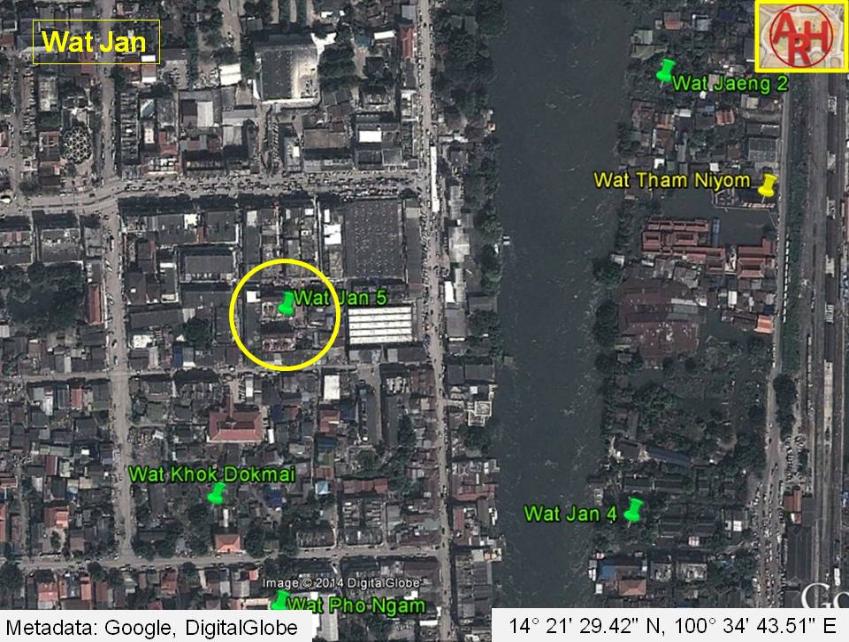 | Wat Jan or the Monastery of the Gold Apple(1) is a defunct temple formerly located on the city island outside the Historical Park in Ho Ratanachai Sub-district. The monastery was situated between Wat Rong Ma (aka Wat Khok Ma) and Wat Pho Ngam along the old eastern city wall and the Front city Canal. The temple must have been situated near the location of the present Jao Pho Jui shrine (ศาลเจ้าพ่อจุ้ย) Historical data about the monastery and its construction are unknown. The temple is not mentioned on Phraya Boran Rachathanin's map drafted in 1926, but features on a map drafted in the mid 19th century. The site must have been approximately located in Geo Coord: 14° 21' 29.42" N, 100° 34' 43.51" E. Footnotes: (1) Gold apple tree (Diospyros decandra). |