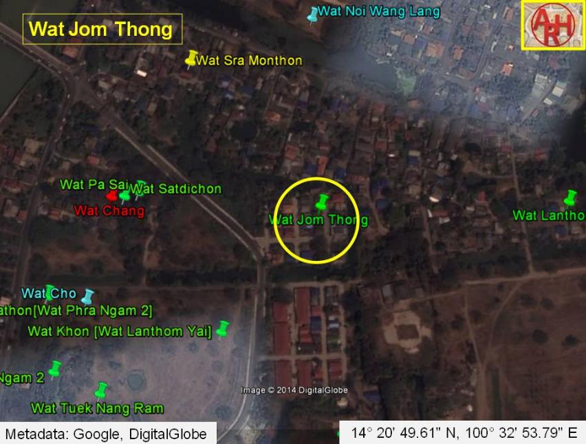 Wat Jom Thong or the Monastery of the Golden Peak was located on the city island in the western area of Ayutthaya in Pratu Chai sub-district. The site is indicated on a mid-19th century map. The monastery was situated on the north bank of Khlong Tha Phra also called Khlong Klaep between Wat Lanthom Noi and Wat Chang. On Phraya Boran Rachathanin's (PBR) map drafted in 1926, there is a temple denominated Wat Jom Thong but situated to the east of Wat Suan Luang and south of Wat Rat. The positions of Wat Jom Thong on both maps does not match. There are no traces anymore visible of the monastery above ground level. I think it would be unjust to conclude that there were only monasteries situated at the origin and near the mouth of Khlong Tha Phra and nothing in between them. There should have been more monasteries along this canal as indicated by the mid-19th century map. I presume this area was already cleared of temple ruins prior Phraya Boran Rachathanin's arrival in Ayutthaya. Historical data about the monastery and its construction are unknown. The mid-19th century map indicates the presence of a chedi. The site must have been approximately situated in Geo Coord: 14° 21' 9.04" N, 100° 33' 3.29" E. |