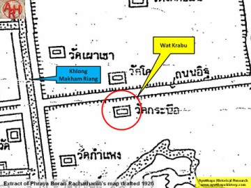 Wat Krabue or the “Monastery of the Buffalo” was located on the city island in the eastern area of Ayutthaya in Ho Ratana Chai Sub-district. The temple was situated north of Wat Suwan Dararam and east of Khlong Nai Kai presently called Khlong Makham Riang. Wat Kho and Wat Krabue lie just opposite of each other while Wat Ho Rakhang was situated in its north-west.