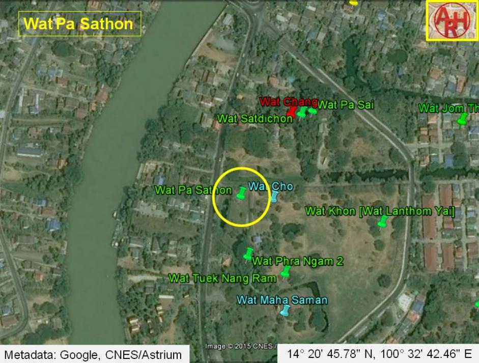 Wat Pa Sathon or the Monastery of the Santol Quarter (1) was situated on the city island in the southwestern area of Ayutthaya in Pratu Chai Sub-district. The monastery stood on the bank of Khlong Tha Phra also called Khlong Klaep. In its immediate vicinity were Wat Satdichon, Wat Pa Sai and Wat Chang. There are no traces of foundations or brick work at ground level and the temple is classified as disappeared. The site is mentioned on Phraya Boran Rachathanin's map drafted in 1926 on the northern canal bank. A 2007 Fine Arts Department (FAD) map based on conducted excavations shows Wat Pa Sathon on the opposite side of the canal as in contrary what is indicated by Phraya Boran Rachathanin. Historical data about the monastery and its construction is unknown. The site is located in geographical coordinates: 14° 20' 45.78" N, 100° 32' 42.46" E. Footnotes: Sathon (สะท้อน) also called krathon (กระท้อน) = Santol also called sour apple or cotton fruit. Latin name: (Sandoricum koetjape). |