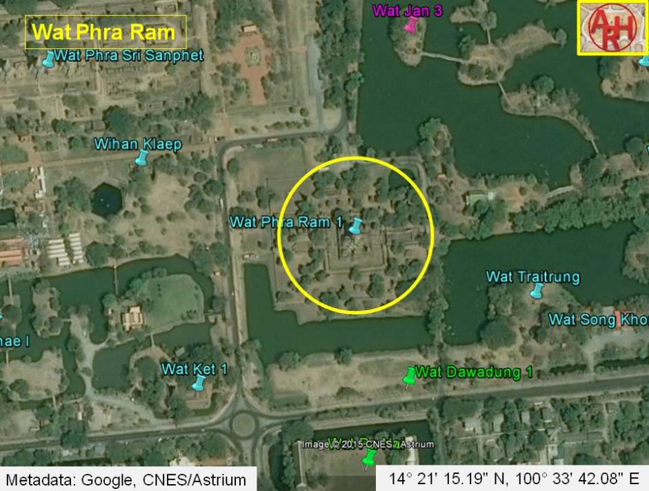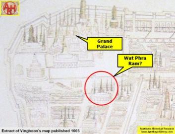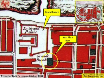 On the most accurate map of the French Engineer Jacques Nicolas Bellin (1703-1772), likely based on data provided by another French Engineer de La Mare (who participated in the first French Embassy to Siam), we find Wat Phra Ram clearly indicated as the "Grande Pagode". |