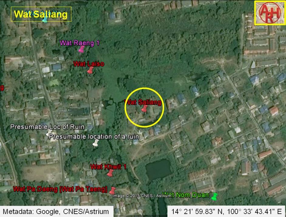 | Addendum Wat Saliang or the Monastery of the Palanquin was located off the city island in the northern area of Ayutthaya in Khlong Sra Bua Sub-district. The monastery stood in area called before Thung Kaeo, along the east bank of Khlong Ban Pla Mo; a canal running adjacent to Khlong Sra Bua and which probably ran into the old Lopburi River near Wat Khae. The temple was located north of Wat Nom Duan, southeast of Wat Laiso and northeast of Wat Khwit. The monastery is indicated on 1974 and 1993 Fine Arts Department (FAD) maps. On a 2007 FAD map, the ruin is indicated in a wrong position. The ruin of Wat Saliang is located in Geo. Coord.: 14° 21' 59.83" N, 100° 33' 43.41" E. |