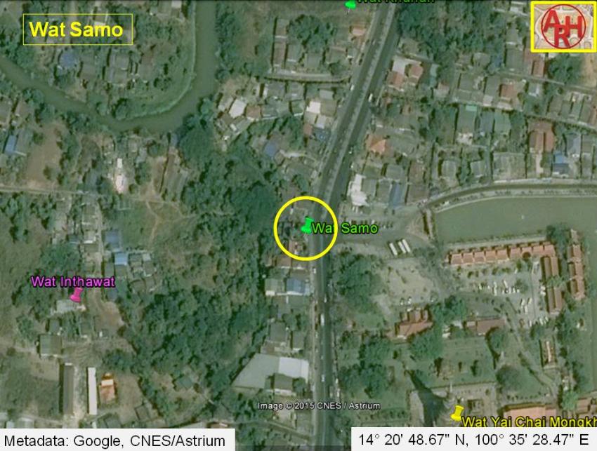 | Wat Samo or the Monastery of the Anchor was a monastery situated off the city island in the eastern area of Ayutthaya in Suan Phlu Sub-district. The temple was located on the east bank of a canal running south (1) along the present Wat Yai Chai Mongkhon premises and which was originating at the confluence Khlong Dusit and Khlong Khao San. This canal - Khlong Khanom Tan - was likely the western moat around Wat Yai. Wat Samo stood as thus in the northwestern corner of what was possibly in earlier times an old Khmer sanctuary. The site is not indicated on a mid-19th century map, neither on Phraya Boran Rachathanin's map drafted in 1926 and features only on a FAD 1974 map [1] and FAD 1993 map [2]. The monastery's historical background and period of construction are unknown. The old texts recount that inhabitants from Ang Thong, Lopburi, Inburi, Phromburi, Singburi, Sanburi (1) and Suphanburi brought in paddy by boats and moored in front of Wat Samo, Wat Khanun and Wat Khanan, where they sold their merchandise. The local villagers in the vicinity of these three temples set up rice mills. The milled rice was sold in the city and to the local Chinese liquor distillers at Pak Khao San village. In the season when the junks set sail for China milled rice was sold as provisions for the junks. [3] Wat Samo is now buried under Road 3477 passing Wat Yai more or less in front of its parking lot. A commemoration pavilion for Wat Samo has been built on the west side of the road. A villager living in the vicinity of the pavilion stated that before Rd 3477 leading to Bang Pa-In was built, a canal existed in front of Wat Samo; called Khlong Wat Samo. (1) If this was indeed the case than this canal could have been the western moat of Wat Yai and leading to Wat Bot Daeng. Footnotes: (1) Interview on 1 February 2012 adjacent sala Wat Samo. References: [1] FAD 1974 map - courtesy Dr. Surat Lertlum - Program Head of Computer Science Program - Chulochomklao Royal Military Academy. [2] FAD 1993 map - courtesy Khun Supot Prommanot - Director of the 3th Regional Office of Fine Arts. [3] Phanna phumisathan Phra Nakhon Sri Ayutthaya: Ekasan jak Ho Luang - Geographical description of Ayutthaya: Documents from the palace - Dr Vinai Pongsripian - Bangkok (2007) - page 89-90. |