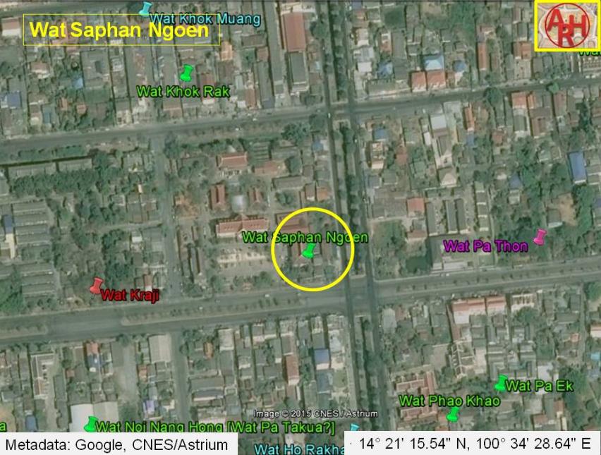 | Wat Saphan Ngoen or the Monastery of the Silver Bridge is a defunct monastery once located on the city island in the eastern part of Ayutthaya in Pratu Chai Sub-district. The monastery was situated on the crossing of Khlong Nai Kai (present Khlong Makham Riang) and Pa Thon Street, as thus in the vicinity of the bridge over the canal. The temple stood on Khlong Nai Kai's west bank, easy accessible via the waterways. There are no traces anymore visible of the monastery above ground level. Historical data about the monastery and its construction are unknown. The site is indicated on Phraya Boran Rachathanin's map drafted in 1926 and was located in geographical coordinates: 14° 21' 15.54" N, 100° 34' 28.64" E. |