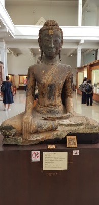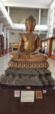 | (Bronze Buddha image in the attitude of subduing Mara; dated 19th century in the Bangkok style and originated from Wat Sawang Arom. Displayed at the Chao Sam Phraya National Museum in Ayutthaya.) |