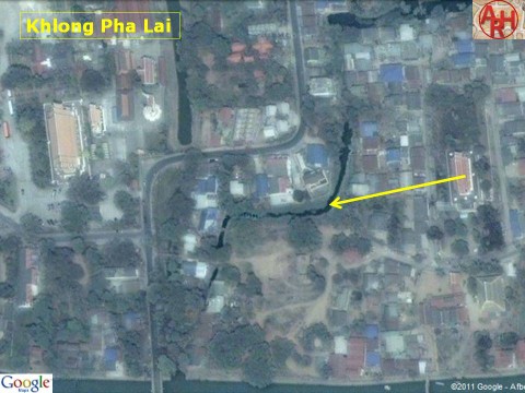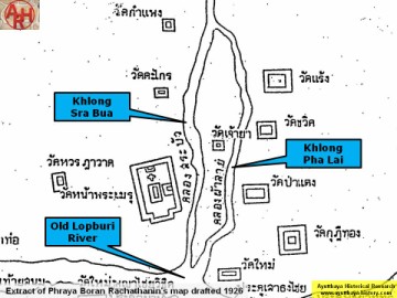 | Khlong Pha Lai or the Canal of the Patterned Cloth was a canal situated off the city island in the northern area running partly in present Tha Wasukri and Khlong Sra Bua sub-districts. The canal is defunct, but there are still some stretches existing from this canal. Most of the waterway though, has been filled up. Khlong Pha Lai was in fact a loop of the Sra Bua Canal and split off from the latter near Wat Kamphaeng. The canal had its mouth west of Wat Mai (Khlong Sra Bua) and ran adjacent to Khlong Sra Bua into the old Lopburi River, a stretch of water called today the City Canal (Khlong Mueang). Wat Chao Ya stood on its west bank, while Wat Raeng, Wat Khwid and Wat Pa Daeng were on its east side. Phraya Boran Rachathanin's map drafted in 1926, still indicates this canal. Khlong Pla Mo branched off from Khlong Pha Lai between Wat Pa Daeng and Wat Kuti Thong. |