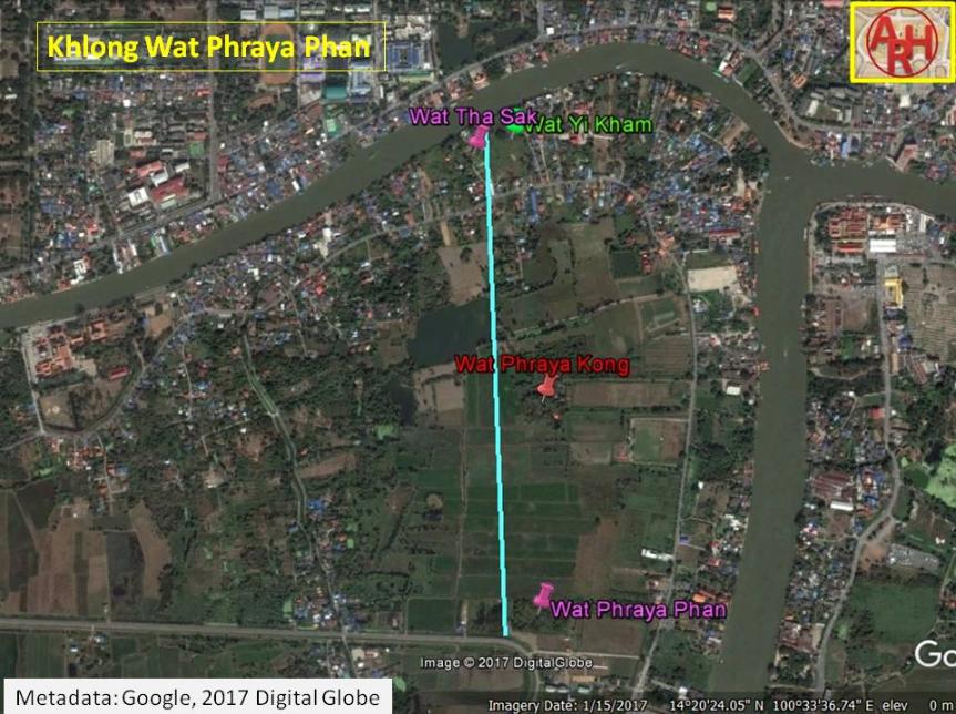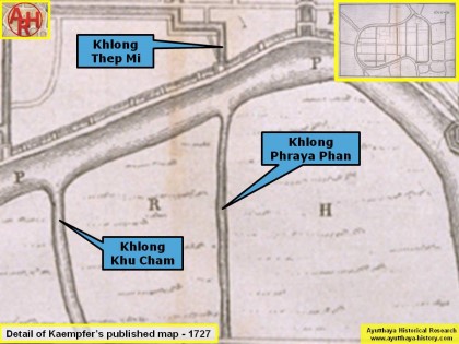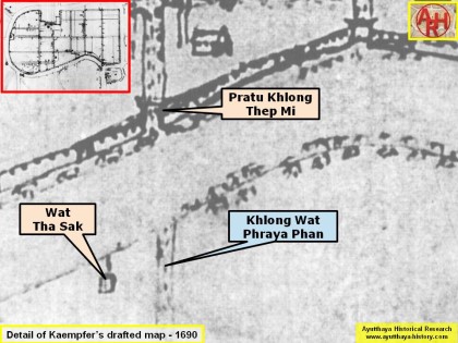 | Based on these maps the origin of the canal was situated between Wat Tha Sak and Wat Yi Kham (Wat Tha Sak can be noticed on Kaempfer's draft map). The waterway split off from the loop in the old Lopburi River (today the Chao Phraya River) just opposite Pratu Khlong Thep Mi. The canal ran towards Wat Phraya Phan, passing along the west side of Wat Phraya Kong. |