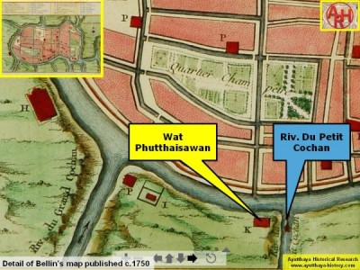 | Conclusion Khlong Phuttaisawan's existence is not confirmed, although it is mentioned on Bellin's map as the "Little Khu Cham". Nevertheless I am of the opinion that there could have been a canal because I trust that the French were familiar with the boundaries of their settlement; additionally, there are some water stretches still existing in the area today, which could have been part of this canal. The waterway could have been dug at the same time of the construction of Wat Phutthaisawan. As thus either the canal existed, or the French maps must be incorrect. In the latter case "Little Khu Cham" on Bellin's map could refer to Khu Cham itself (with Wat Phutthaisawan wrongly positioned), while the canal on its east would then be Khlong Phraya Phan, a situation identical to Kaempfer's map. |