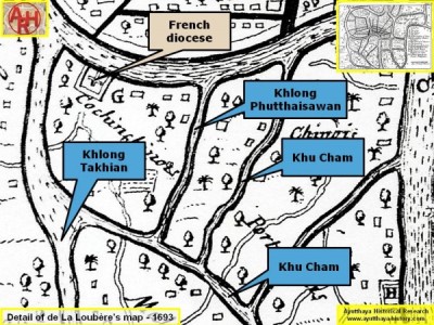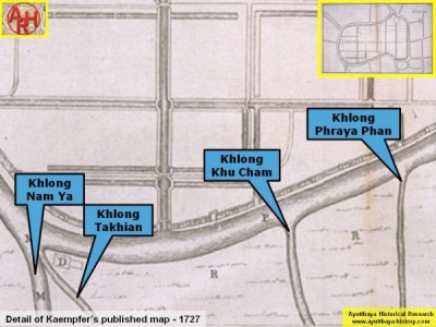 | The canal is not found on the Vingboons painting, neither on the maps of de Courtaulin (1686), De Graaff (1690) or Kaempfer (1727). It is as thus remarkable that this canal does not figure on Kaempfer's published map as he surveyed the area in 1690. Kaempfer's map has four waterways on the opposite bank of the south side of Ayutthaya. These are, based on their positions vis-à-vis the city of Ayutthaya: Khlong Nam Ya and Khlong Takhian near the French diocese; Khlong Khu Cham, opposite and slightly east of Pratu Chakrai Noi in front of the Chakrai Noi Fortress; and Khlong Phraya Phan, opposite Pratu Khao Sami. The more, all the positions of the above canals are correct based on today's satellite imagery. Kaempfer shows the northern border from the Cochin-Chinese settlement from Khlong Takhian until Khlong Phraya Phan (marked with the letter R on the map). |