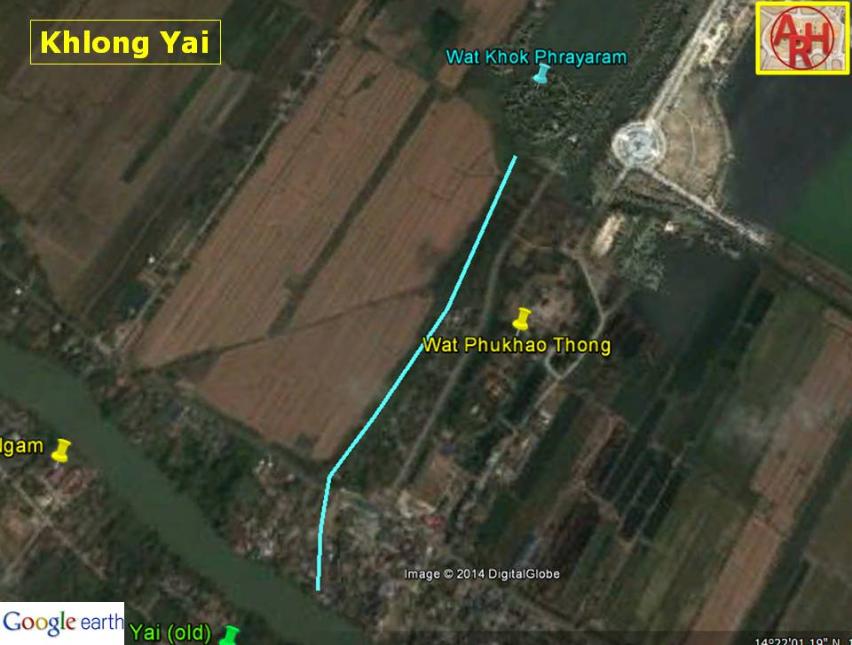 | Khlong Yai or the Large Canal was situated in the northern area of Ayutthaya in the Phukhao Thong fields and connected Wat Khok Phraya Ram via a stretch of the Bang Kaeo River to Hua Laem, the northwestern point of Ayutthaya's city island (1). The mouth of the today defunct canal stood opposite Khlong Wat Pom, a canal leading to Wat Worachet. Wat Phukhao Thong stood on its east bank and was on its turn connected to the same stretch of the Bang Kaeo River. Khlong Yai was probably part of the Maha Nak Canal, a canal system built out of defense purposes. Footnotes: (1) This stretch became in the mid-19th century the river bed for the Chao Phraya River, when the latter was deviated towards Ayutthaya. |