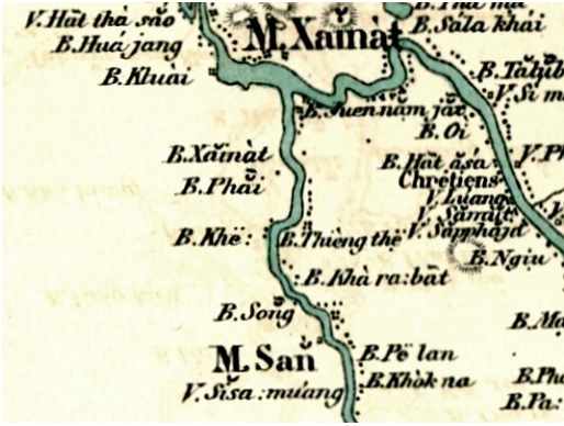 | (Detail of the map "Cours du Fleuve Me-Nam dressé par R.P. Lombard, missionnaire apostolique de Siam 1878-1879") |