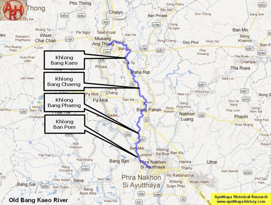 | After 500 meter it ran into the present irrigation canal running through Hua Phai of Maha Rat district, Han Sang, Ta Nim, Bang Nang Ra, Khwan Mueang and Phut Lao of Bang Pahan district. From Ban Nonsi in Phut Lao sub-district, the river turned southwest towards Ban Mai and then turned southeast towards Ayutthaya. The Bang Kaeo River joined the old Lopburi River at Hua Laem at the northwestern point of the city in front of Sat Kop Fortress. The irrigation canal spoken of above, starting near Wat Han Sang and running through Ban Chaeng and Ban Ta Nim towards Ban Li (No 2) was named Khlong Bang Chaeng. The waterway from Ban Li (No 2) near Wat Pa Mung through Ban Li (No 3) and Ban Nonsi towards Ban Khlong Phaeng was called Khlong Bang Phaeng. (2) [1] From Ban Khlong Phaeng opposite Ban Mai (2) it continued towards Ayutthaya along Ban Pom. This last water track was referred to as Maenam Ban Pom. [2] |
