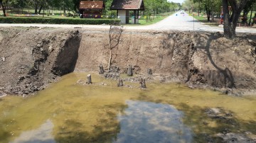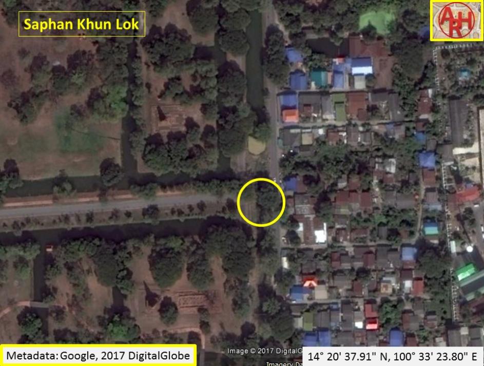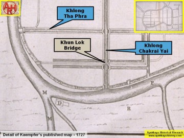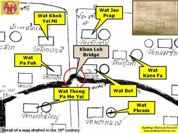 | Saphan Khun Lok or the Khun Lok Bridge (1) is a defunct wooden bridge once located on the city island in the southern-western part of Ayutthaya. The remains of this bridge became visible in 2017, when the Fine Arts Department made archaeological excavations along Khlong Chakrai Yai and encountered the remnants of the wooden bridge poles. The wooden bridge was located in between Wat Jao Phram and Wat Ubosot, both part of the Somdet Phra Sri Nakharin Park and crossed Khlong Chakrai Yai in a east-west direction. The wooden bridge was built over Khlong Chakrai Yai, which was a shortcut in the loop of the old Lopburi River (later Khlong Mueang or City Canal) linking Pratu Khlong Pak Tho in the north with Pratu Khlong Chakrai Yai in the south. The northern part of the canal was called by the locals Khlong Tho and ran along the western wall of the Grand Palace. In the Ayutthaya Era.At there was a fresh market, called Khun Lok Market, at the foot of the Khun Lok Bridge in front of Wat Kaeo Fa. [1] Footnotes: (1) Khun Lok could be translated as "Ruler of the World", which is in fact Brahma, the Creator. There could be a link between the name of the bridge and Wat Jao Phram (Lord Brahma). References: [1] Phanna phumisathan Phra Nakhon Sri Ayutthaya: Ekasan jak Ho Luang - Geographical description of Ayutthaya: Documents from the palace - Dr. Vinai Pongsripian - Bangkok, Usakane, n. d. (2007). |