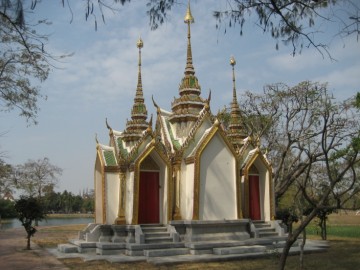 Ayutthaya Maha Prasat (Ayutthaya Great Castle) is located on an islet in the middle of Bueng Phra Ram, a marshy lake in the center of the City of Ayutthaya. The islet is only accessible through a foot bridge. The shrine was built 1968-1970 and dedicated to the spirit of King U-Thong, the founder of Ayutthaya and the other kings of the Ayutthaya period. There are different accounts on the founding of Ayutthaya [1], but in general - with or without the miracles - the legend goes that Prince U-Thong had to migrate south due to a plague in his city state (the exact place is still food for discussion) and sought a suitable location to settle down. The prince came to an area called "Nong Sano" or "Sano Swamp", where he encountered a hermit (rusi). The hermit claimed he had been there since the time of the Buddha and that the Buddha came to that place and prophesied that one day a great city would been built there. So Prince U-Thong decided to construct a new city on the spot and established Ayutthaya on 4 March 1351, to rule over it with the title of King Ramathibodhi I. "In 712, a year of the tiger, on Friday, the sixth day of the waxing moon of the fifth month, at three nalika and nine bat after the break of dawn, the Capital City of Ayutthaya was first established." [2] The shrine has been supposedly built on the place where Brahman priests obtained a conch shell, which turned to the right, beneath a sebesten (1) bush, when performing the Rite of Atonement (founding ceremony for the city). Following the legend King U-Thong had a tiny castle built to house the shell. The Prasat is a beautiful shrine on a two-indented base and with a nicely decorated roof with three spires, worthwhile a visit. A statue of King Ramathibodi I (King U - Thong) is enshrined within on a marble pedestal in which, - the story goes - his spirit and the spirits of five former Ayutthayan kings remain. The celestial pavilion is depicted in Ayutthaya's provincial seal under a Manjack tree, while a conch is placed on a pedestal tray within. Footnotes: (1) Sebesten is an edible fruit coming from the Fragrant Manjack tree (Cordia dichotoma). Cordia is a genus of shrubs and trees in the borage family, Boraginaceae. Around 300 species have been identified worldwide and are commonly called Manjack. References: [1] The Rise of Ayudhya - Charnvit Kasetsiri - 1976 Oxford University press - page 61- 62. [2] The Royal Chronicles of Ayutthaya – Richard D. Cushman (2006) - page 10 / Source: Luang Prasoet. |