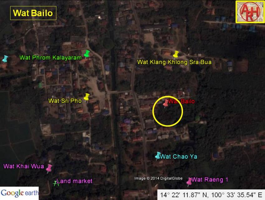 | Wat Bailo was located off the city island in the northern area of Ayutthaya in Khlong Sra Bua Sub-district. The temple was situated on the west bank of Khlong Ban Pla Mo in an area called Thung Kaeo. Wat Klang Khlong Sra Bua stood in the north, Wat Sri Pho and Wat Phrom Kalayaram in the west and Wat Chao Ya on its southern side. In situ is an un-excavated ruin of a monastic structure totally covered with vegetation. Some brickwork is still standing. Historical data about the monastery and its construction are unknown. The site is mentioned on Phraya Boran Rachathanin's map drafted in 1926, but indicated on his map north-east of Wat Klang Khlong Sra Bua. Wat Bailo figures also on the Fine Arts Department maps. The site is located in Geo Coord: 14° 22' 11.87" N - 100° 33' 35.54" E. |