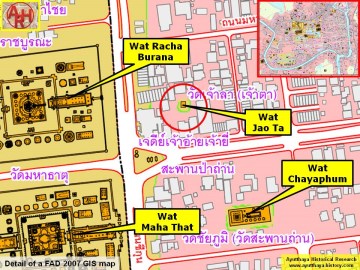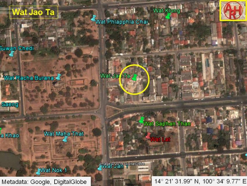| Wat Jao Ta or Grandfather's Monastery was located on the city island outside the Historical Park of Ayutthaya in the north-eastern area in Pratu Chai sub-district. The monastery was situated on the east bank of the (now defunct) Khlong Pratu Khao Pluak. Wat Jao Ta stood more or less in the middle between Wat Racha Burana and Wat Phlapphla Chai on the opposite side of the canal. The Elephant Bridge was in the north and the Pa Than Bridge in the south. There are no traces anymore visible of the monastery above ground level. Historical data about the monastery and its construction are unknown. The site is indicated on Phraya Boran Rachathanin's map drafted in 1926 and features also on a mid-19th century map. Wat Jao Ta was situated in Geo Coord: 14° 21' 31.99" N, 100° 34' 9.77" E. |