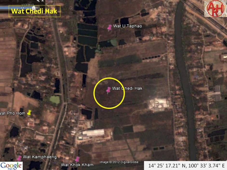 | Wat Chedi Hak or the "Monastery of the Broken Stupa" was located off the city island in the northern area of Ayutthaya in Pho Sam Ton Sub-district of Bang Pahan in Ayutthaya Province. The temple was located in between Wat U Taphao and Wat Khok Kham, on the east bank of the old Lopburi River, on a stretch called Khlong Ban Muang (Khlong Pho Sam Ton) today. With the exception of some broken bricks, fragments of sema stones of the ordination hall and pieces of broken Buddha images, nothing remains of this old temple. Some digging must be still ongoing in situ, as we found fresh traces. In the vicinity we met a local who told us that the all the (good) bricks of this former temple had been broken out and transported by boat to Bangkok in the beginning of the 1950's. He said that only broken bricks were left and some sema stones remained (as confirmed with what we saw). [1] The historical background and period of construction of the former monastery are not known. Wat Chedi Hak is situated in Geo Coord: 14° 25' 17.21" N, 100° 33' 3.74" E. References: [1] Interview with Khun Tawet on 11 January 2013 in the vicinity of Wat Chedi Hak. |