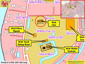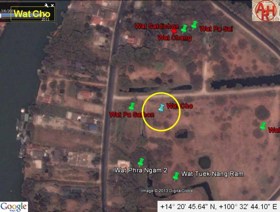 | Wat Cho (1) is located on the city island in the southwest area in Pratu Chai Sub-district, northwest of the Somdet Phra Sri Nakharin Park. The site is part of the Ayutthaya Historical Park. The ruins of the temple lay east of U-Thong Rd, more or less opposite Wat Chai Watthanaram. The ruins can be easily reached. Wat Cho stood on the south bank and close to the mouth of Khlong Tha Phra (also called Khlong Klaep). At the mouth was a water gate called Pratu Khlong Klaep (Pratu Khlong Tha Phra) and a boat landing in connection with Wat Lot Chong, called Phra Racha Wang Lang Landing. The foundations of the monastery are still visible, being likely from a sermon hall. No traces of boundary stones were found. The entry of the hall is to the east. The floor of the main chedi is situated on the west side of the hall. The hall was surrounded by an inner wall, while the whole complex was protected by an outer wall. The history and period of construction of Wat Cho is not known. Wat Cho is indicated on a mid-19th century map in an identical position as on Phraya Boran Rachathanin's (PBR) map drafted in 1926, east of Wat Phra Ngam. Wat Maha Saman was situated south. On the oldest map Wat Chang was located opposite, on the north bank of the canal; but PBR indicates a cluster of four temples in that location. The site is located in geographical coordinates: 14° 20' 45.64" N, 100° 32' 44.10" E. Footnotes: Cho (เฉาะ.) = to chop, break or slit open or (เฉาะ ๆ ) = comfortable. |