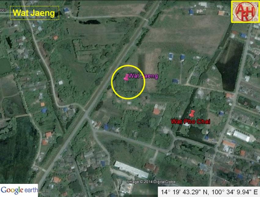 | Wat Jae or the Small Monastery was situated off the city island in the southern area of Ayutthaya in Khlong Takhian sub-district along Khlong Wat Jaeng. The temple was situated south of Wat Phraya Phan and west of Wat Pho Chai. In situ is a brick mound covered in vegetation. Its historical background and period of construction are unknown. The monastery is mentioned on a Fine Arts Department map drafted in 1993 and located in Geo Coord: 14° 19' 43.29" N, 100° 34' 9.94" E. I presume the denomination on the FAD map is not correct and the monastery was called Wat Jaeng, identical to the denomination of the canal in its vicinity. |