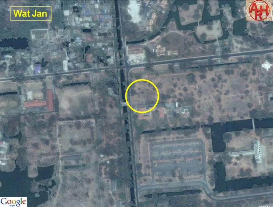 | Wat Jan or the Monastery of the Moon (1) is a restored ruin located on the city island in the Historical Park of Ayutthaya in Pratu Chai Sub-district. The temple was located on the corner of Talaeng Kaeng road and Khlong Chakrai Yai (the northern stretch - in the vicinity of the Grand Palace - is called Khlong Pak Tho). The monastery stood as thus near the Lam Hoei Bridge. On the opposite side of Khlong Chakrai Yai stood Wat Khok Khamin (defunct), while on its south was Wat Rak (defunct). The Phra Khan shrine stood in the east. In situ, only some brick foundations of the monastic structure remains. The site is mentioned on Phraya Boran Rachathanin's (PBR) map drafted in 1926, but features also on a map drafted in the mid 19th century. Wat Jan is positioned here identical as on PBR's map, but stands at the mouth of a canal running parallel with Talaeng Kaeng road. This canal turns after a few hundred meters into Khlong Pratu Tha Phra (aka Khlong Klaep). PBR does not mention this canal on his map; but aerial pictures still show some stretches of water south of the road leading to the old distillery. Wat Jan's historical background and period of construction are unknown. On the PBR map the temple is called "Monastery of the Moon" (วัดจันทร์), while on the mid-19th century map it is called "Monastery of the Gold Apple" (วัดจัน). (2) The site is located in geographical coordinates: 14° 21' 3.31" N, 100° 33' 22.75" E. Footnotes: (1) The denomination of Phraya Boran Rachathanin has here been followed. (2) Chan (Diospyros Packmanil - C. B. Clarke). A tall tree which bears yellow fruit. When ripe the shape of the fruit resembles the moon. Hence its name. The tree was not usually grown in the house compound, but curiously are to be found in monasteries and the royal palace compounds. If a person dares to plant such trees in his residential compound, misfortune will occur sooner or later to the owner. [1] References: [1] Some Siamese Superstitions about trees and plants - Phya Anuman Rajadhon - JSS Vol 49.1 - 1961 - page 59. |