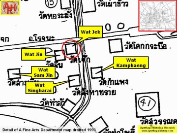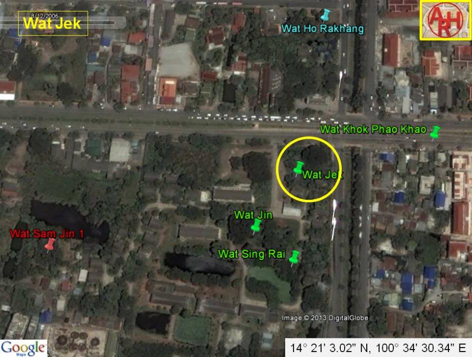 | Addendum On a 19th century map we find a temple called Wat Tha Phai or the "Monastery of the Landing of the Paddle" in the area where Wat Jek was situated. As the word "landing" appears in its name, the temple was likely situated on the west bank of Khlong Nai Kai at present called Khlong Makham Riang. Wat Tha Phai could as thus be just another or old name for Wat Jek. The map indicates no existence of a chedi or prang. It is only my assumption that Wat Jek and Wat Tha Phai were one and the same temple. Making an assessment of all the monastic structures, in the zone demarcated by Chikun Road, Pa Thon Road, Pridi Banomyong Road and U-Thong Road is rather difficult, as the position and name of the structures vary on different maps. On a 19th century map, there are 15 structures counted, while on the 20th century PBR map there are 13 mentioned. There is inconsistency in the names and the positions. Even maps drafted by the Fine Arts Department, what I presume, based on excavations in the zone, shed no light on this matter. Positions of monastic structures can be asserted, but their ancient names will remain questioned forever. The site is located in geographical coordinates: 14° 21' 3.02" N, 100° 34' 30.34" E. |