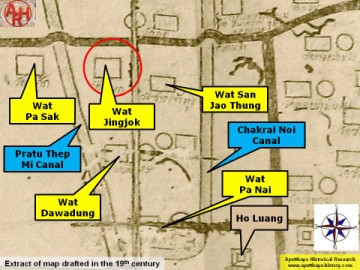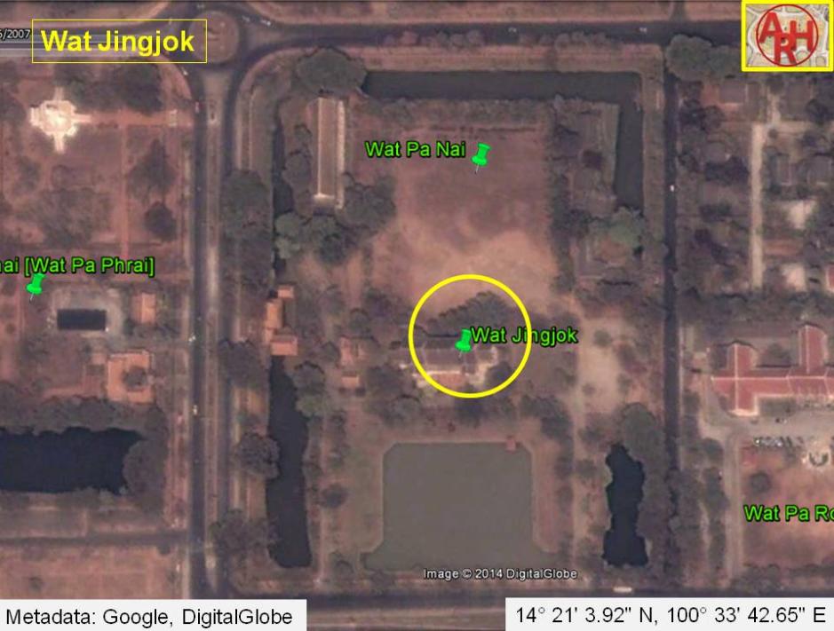 | Wat Jingjok or the Monastery of the House Lizard was located on Ayutthaya's city island outside the Historical Park in Pratu Chai Sub-district. It was situated on the actual premises of the Chao Sam Phraya Museum, North of Rojana Rd, in an area called before Thung Khaek. There are no traces anymore visible of the monastery above ground level. Historical data about the monastery and its construction are unknown. A mid-19th century map shows Wat Jingjok south of Wat Dawadung and east of Wat San Jao Thong, north of the former brick road being an extension of Chinese Street. This location does not match with Phraya Boran Rachathanin's (PBR) map drafted in 1926, which indicates this temple southeast of Wat Pa Nai near the confluence of Khlong Chakrai Noi and the connection canal leading to Khlong Pratu Thep Mi. As thus PBR situates Wat Jingjok more north. The denomination on both maps is also different. The mid-19th century maps shows วัดจิงจก, while PBR writes วัดจิ้กจอก leaving the interpretation open between respectively the "Monastery of the House Lizard" and the "Monastery of the Fox". This author opts for the first translation. The site is located in geographical coordinates: 14° 21' 3.92" N, 100° 33' 42.65" E, at present the museum building itself. |