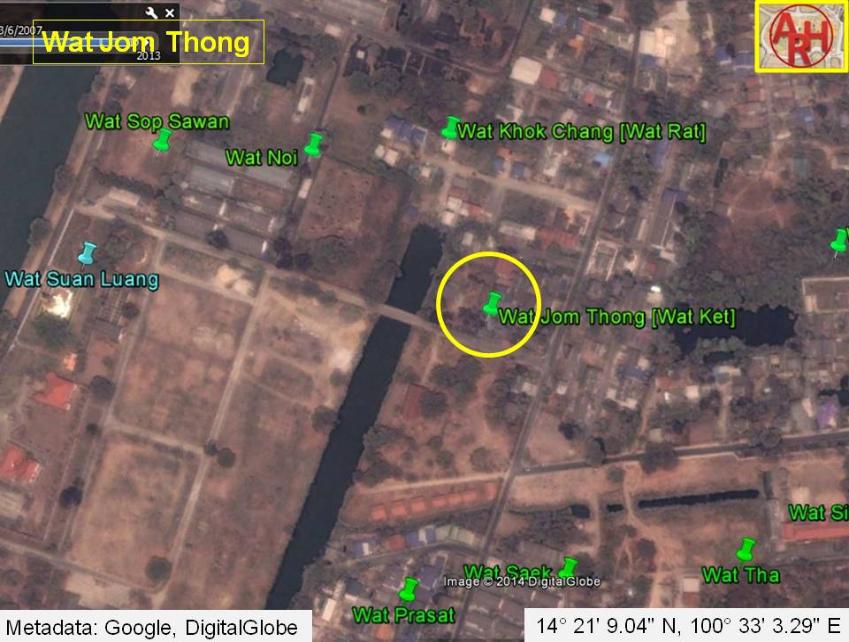 | Wat Jom Thong or the Monastery of the Golden Peak was located on the city island in the southern area of Ayutthaya in Pratu Chai Sub-district. The temple, known also as Wat Ket, was situated south of an ancient canal called Khlong Chang Maha Chai. Wat Khok Chang was north of the temple, while Wat Suan Luang stood on its west. There are no traces anymore of the former monastery. Houses have been built on the site. The temple is classified as disappeared. Historical data about the monastery and its construction are unknown. In front of the monastery and besides the Maha Chai granary (situated earlier along the canal between Wat Suan Luang and Wat Sop Sawan, today in the location of the army camp) was a fresh market called the Head Granary Market. [1] Wat Jom Thong is mentioned on Phraya Boran Rachathanin’s map drafted in 1926 in a nearly identical position as Wat Ket on a mid-19th century map. A 2007 Fine Arts Department GIS map positions Wat Jom Thong east of the Rear Palace, but I believe if this excavation site is correct it must have been likely the remains of a structure of the Rear Palace and not a monastery. The site must have been approximately situated in Geo Coord: 14° 21' 9.04" N, 100° 33' 3.29" E. References: [1] Markets and Production in the City of Ayutthaya before 1767: Translation and Analysis of Part of the Description of Ayutthaya - Chris Baker - Journal of the Siam Society, Vol. 99, 2011 - page 65. |