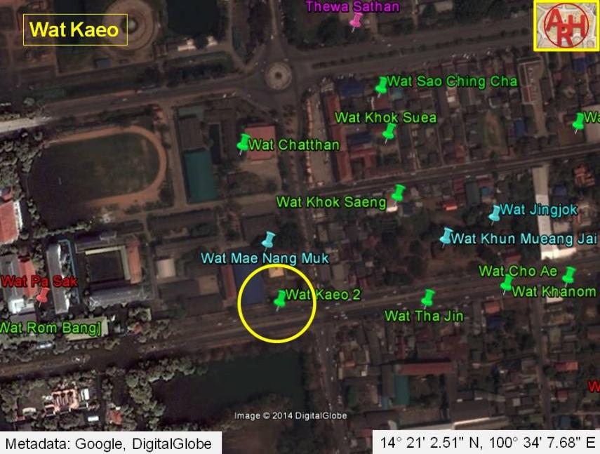 | Wat Kaeo or the Crystal Monastery is a defunct temple once located on Ayutthaya's city island outside the Historical Park in Pratu Chai Sub-district. The monastery features curiously enough not on Phraya Boran Rachathanin's map drafted in 1926, but is indicated on a map drafted in the mid-19th century. (1) On the latter, Wat Kaeo stood south of Wat Mae Nang Muk on the west bank of Khlong Pratu Jin and more or less opposite Wat Khok Suea and Wat Khok Saeng. The mid-19th century map indicates no existence of a chedi nor prang. The monastery's historical background and period of construction are unknown. Footnotes: (1) Phraya Boran Rachathanin indicates however a monastery with an identical name in the area of the present Somdet Phra Sri Nakharin Park. |