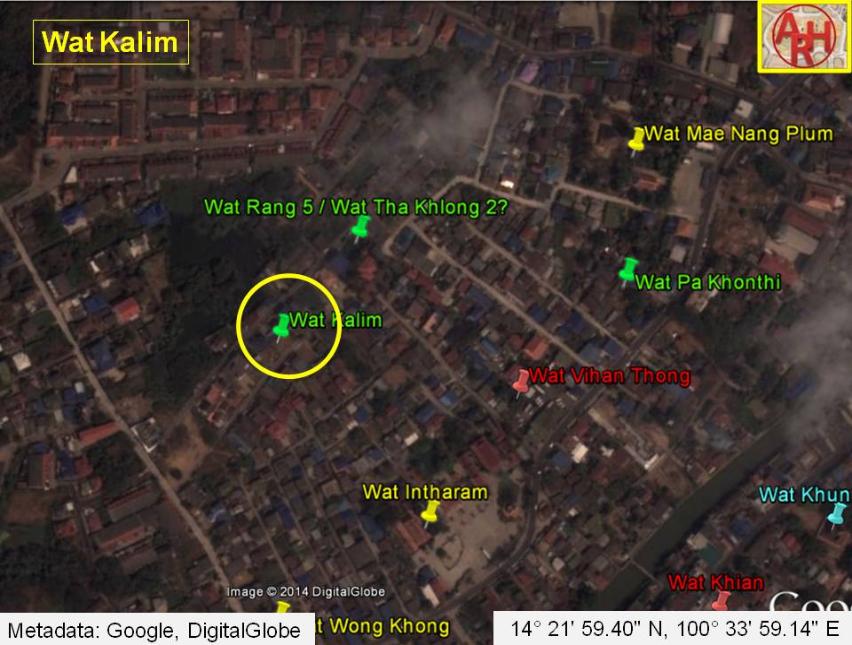 | Wat Kalim was located off the city island in the northern area of Ayutthaya in Khlong Sra Bua Sub-district. The monastery was situated northwest of Wat Intharam (active temple) and west of Wat Vihan Thong (ruin). There are no traces anymore visible of the monastery above ground level. Historical data about the monastery and its construction are unknown. Wat Kalim is only indicated on a 1974 Fine Arts Department map and presumably has never been excavated as no traces appear of it on later Fine Arts Department maps. I do not know the source of the FAD for indicating a former monastery in this location. The site must have been approximately located in Geo Coord: 14° 21' 59.40" N, 100° 33' 59.14" E. |
