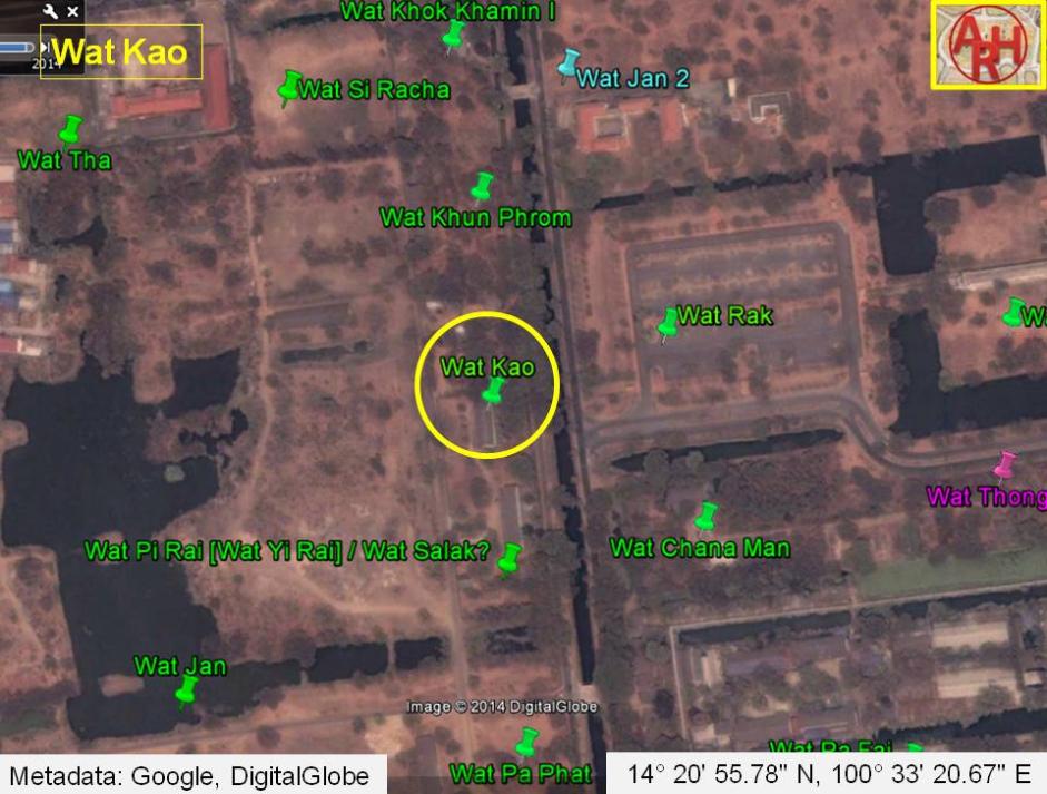 | Wat Kao or the Old Monastery was situated on the city island in the central area of Ayutthaya in Pratu Chai sub-district. The temple was located on the west bank of Khlong Chakrai Yai . Wat Khun Phrom (no traces anymore) stood in the north, while Wat Pi Rai (no traces anymore) was in the south. Opposite Khlong Chakrai Yai stood Wat Rak (no traces anymore). The ancient site was cleared in the early 1970's during construction works of an expansion project of the (former) Ayutthaya Agriculture School (Withayalai Kasetrakam). There are no traces of foundations or brick work anymore at ground level and the temple is classified as defunct. [1] The site is mentioned on Phraya Boran Rachathanin's map drafted in 1926 and on the 1974 and 1993 Fine Arts Department maps. Historical data about the monastery and its construction is unknown. The site should have been approximately located in geographical coordinates: 14° 20' 55.78" N, 100° 33' 20.67" E. References: [1] Bangkok Post - 09 Dec 1972 - Work suspended on Ayutthaya sites. The article states that “machinery engaged on the Ayutthaya Agriculture School extensions ploughed up the ruins of at least five temples in the disputed area”. The work at the school was stopped after students had sent a petition to the NEC. The Director General of the Fine Arts Department at that time stated he was certain the damage had already been done. |